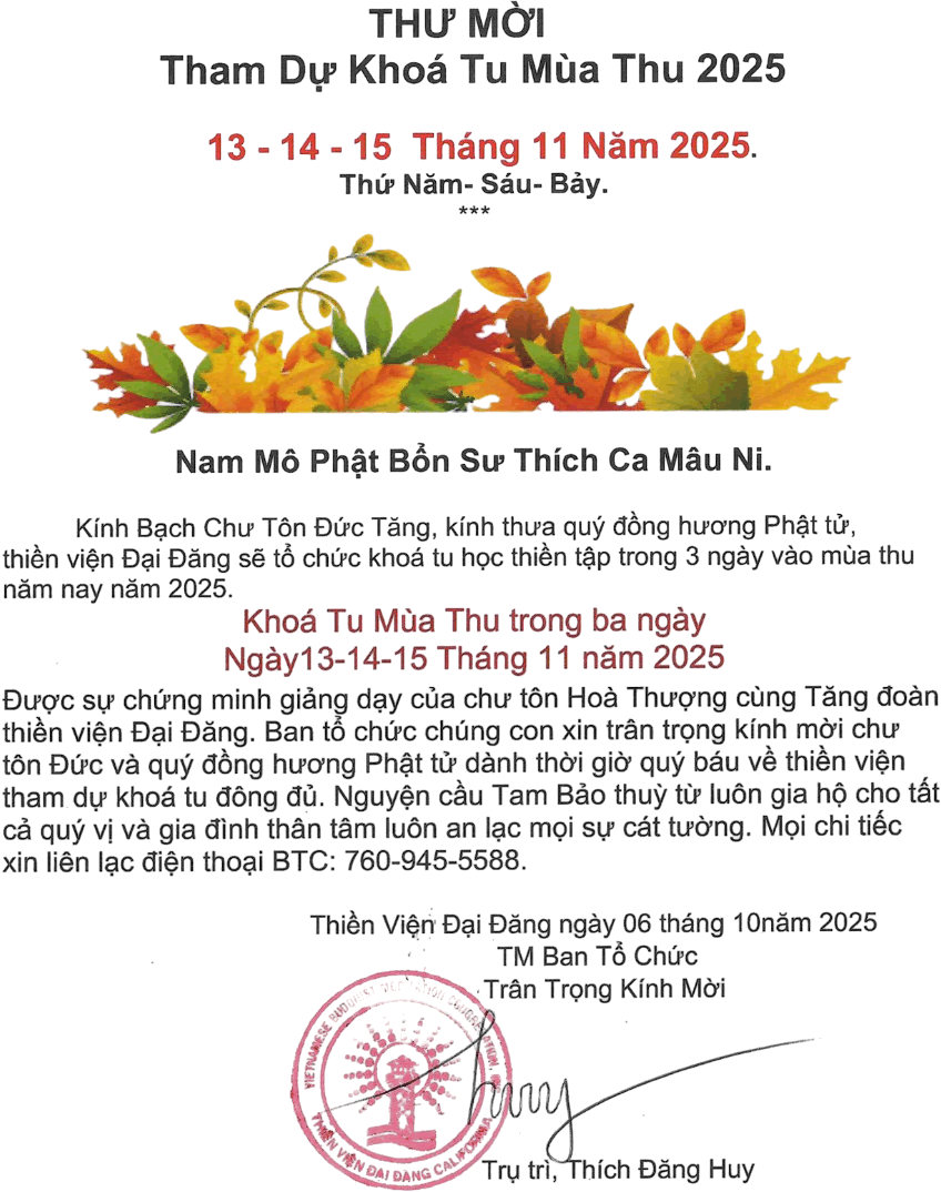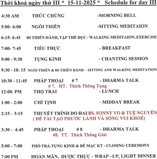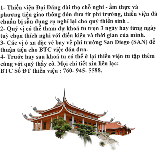 Trong đây cũng có những vị trên dưới sáu mươi nhưng sự tu hành rất tinh tấn.Tất cả Tăng chúng đều sống chung trong tinh thần hòa hợp thương yêu, trợ duyên sách tấn cùng nhau tu tiến. Cuối tuần, hai ngày thứ bảy và chủ nhật là thời khóa tu thường lệ dành riêng cho Phật Tử do chư Tăng hướng dẫn. Ngoài ra nếu có Thiền Sinh nào muốn đến Thiền Viện tu tập dài hạn cũng được khuyến khích, giúp đở. Hiện nay số Phật Tử qui tụ về Thiền Viện mỗi ngày thêm đông bởi do pháp môn tu thiền của Hòa Thượng hội đủ ba tiêu chuẩn: Khế cơ, khế lý, khế thời, cho nên các Phật Tử dễ cảm thông và thực hành đạt được nhiều an lạc. Những người Tây Phương cũng bắt đầu hiểu biết, tiếp nhận Thiền học Phật Giáo qua hệ thống thông tin Internet và sách vở, các bài giảng của Hòa Thượng Tôn Sư đã được phiên dịch ra ngoại ngữ nên cũng tìm đến xin tu học. Vì vậy Thiền Viện Đại Đăng cũng mở thêm một lớp tu Tu học hành thiền cho nhóm Phật Tử người Mỹ vào chủ nhật mỗi tuần. Các Phật tử rất hài lòng mản nguyện và vô cùng hoan hỷ, nhận thấy rằng bao nhiêu công khó đóng góp tài lực của mình để hổ trợ cho Thiền Viện Đại Đăng được hình thành, là một việc làm giá trị có ý nghĩa chính đáng. Tăng đoàn đều là những người đang cố gắng phấn đấu vương lên, tu hành thanh tịnh mẫu mực, để xứng đáng cho các Phật tử đủ niềm tin trở về nương tựa và tu học.