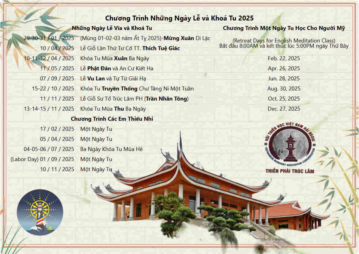 Ngoài ra còn có một số các Tu Viện, Thiền Thất, Đạo Tràng khắp nơi trong nước. Môn đồ pháp quyến Xuất gia tu học theo Ngài có cả hàng ngàn Tăng, Ni và hàng vạn Phật tử trong nước và các nơi trên thế giới như: Mỹ, Pháp, Úc, Canada, Thụy Sĩ. … Riêng tại Mỹ quốc, số Phật tử quy y và tu học theo pháp môn tu thiền của Hòa Thượng Thanh Từ rất đông, nhưng thiếu nơi sinh hoạt thuận tiện cho số đông người, và thiếu người trực tiếp hướng dẫn tu học. Do đó một số Phật tử có tâm đạo nhiệt thành và lòng thiết tha tu học, đã hợp tác cùng nhau đứng ra vận động thành lập Ban Sáng Lập Thiền Viện. Sau khi đề đạt và thưa thỉnh ý kiến đệ trình lên Hòa Thượng đã được Ngài hoan hỉ chấp thuận. Ngài chỉ định một số Phât tử có khả năng hoàn thành tốt Phật sự đại diện thay mặt lãnh trách nhiệm như:Trưởng Ban Sáng Lập, kiêm Hội Phó Hội Thiền học Việt Nam (Hội Trưởng là Hòa Thượng) Hải Ngoại là Phật Tử Chánh Hiền Quang, Tổng thư ký là Phật Tử Quảng Khoái, Thủ bổn là Phật Tử Chân Bảo,v,v …